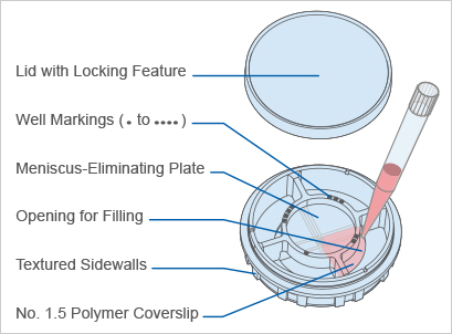 ibidi μ35mm四格培養(yǎng)皿確保了顯微鏡載物臺和物鏡小范圍的移動。由于不同孔之間分隔壁非常薄,每個孔內(nèi)的細胞就可以在載物臺/物鏡小的移動下得以快速成像。